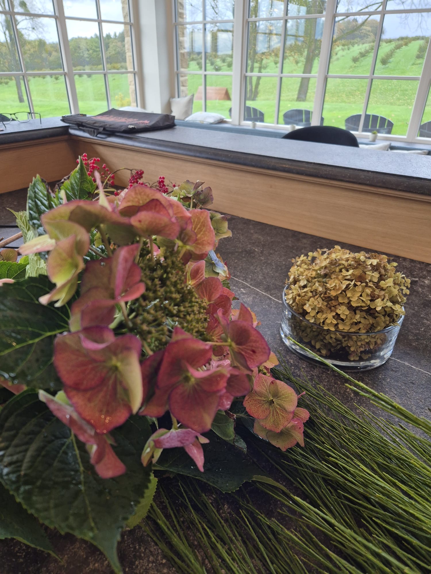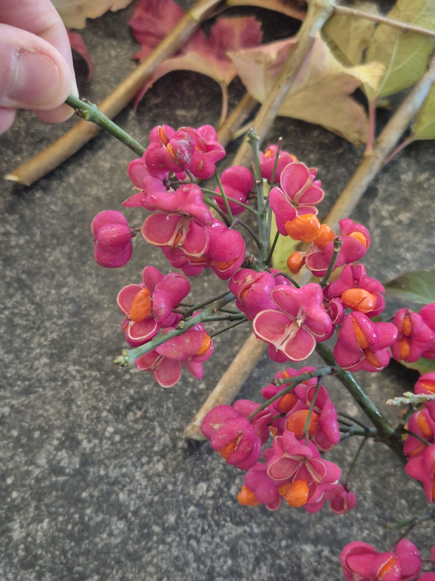 Les couleurs se répondent — vert des feuilles, rouge profond des baies, orange brûlé, mauve délicat 🍃🍷🍊💜
