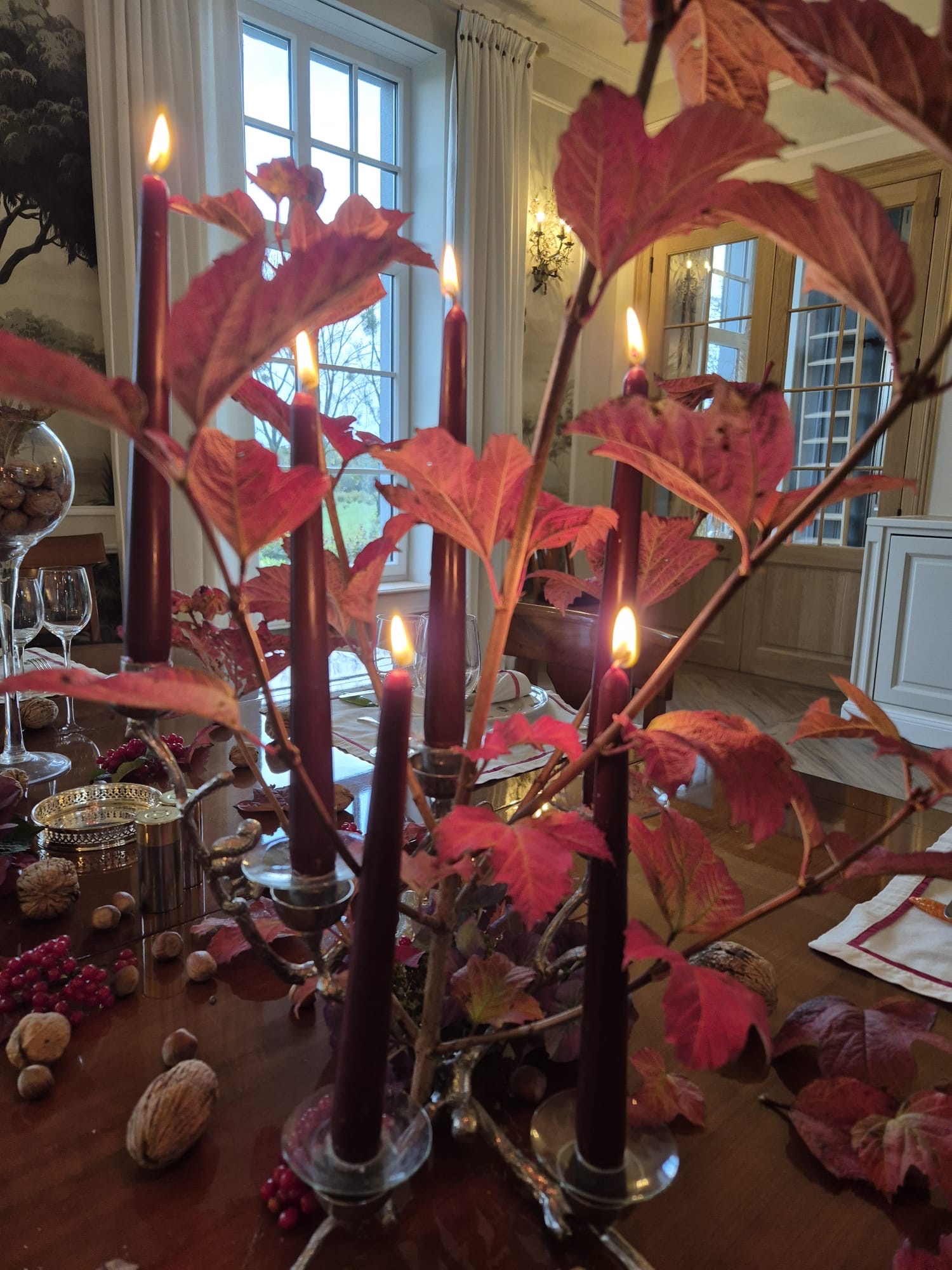 Table automnale décorée : bougies, feuillages vert, rouge profond, orange brûlé et mauve délicat